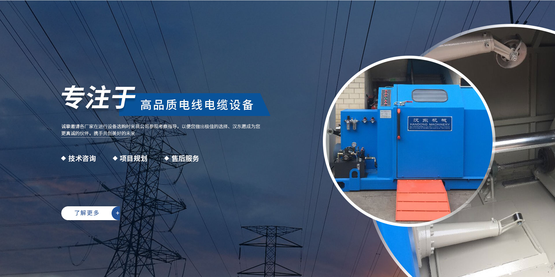 常州漢東機械始創(chuàng)于2006年,是集電線電纜機械設計、開發(fā)、制造、安裝、調試為一體化的高科技企業(yè)。本公司自開業(yè)以來,積極引進日本,歐美等國外電線電纜設備之先進技術,先后成功推出了達到行業(yè)先進水平的電線電纜設備,主要產品有擠出、繞包、束線、成纜等電線電纜固定設備。在提供系統設備的同時,還向客戶提供售前技術咨詢、項目規(guī)劃、以及售后服務。我公司本著“以人為本、科技先導、用戶為上”的宗旨,為客戶提供牢靠的產品與省心的服務。漢東愿成為您更真誠的伙伴,攜手共創(chuàng)美好的未來! 了解更多+